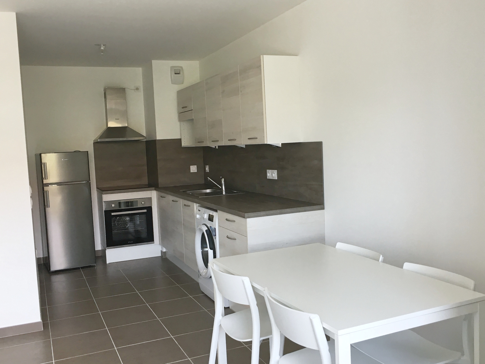 L'appartement dispose d'une cuisine ouverte donnant sur le séjour, un balcon, une chambre, une salle de bains avec wc et un garage en sous-sol.