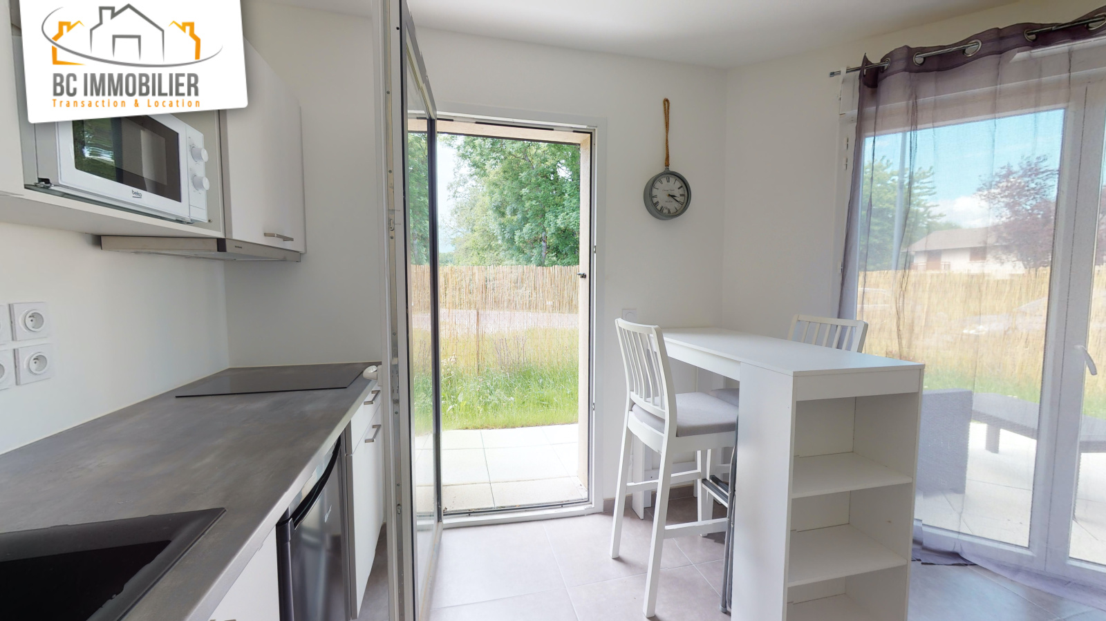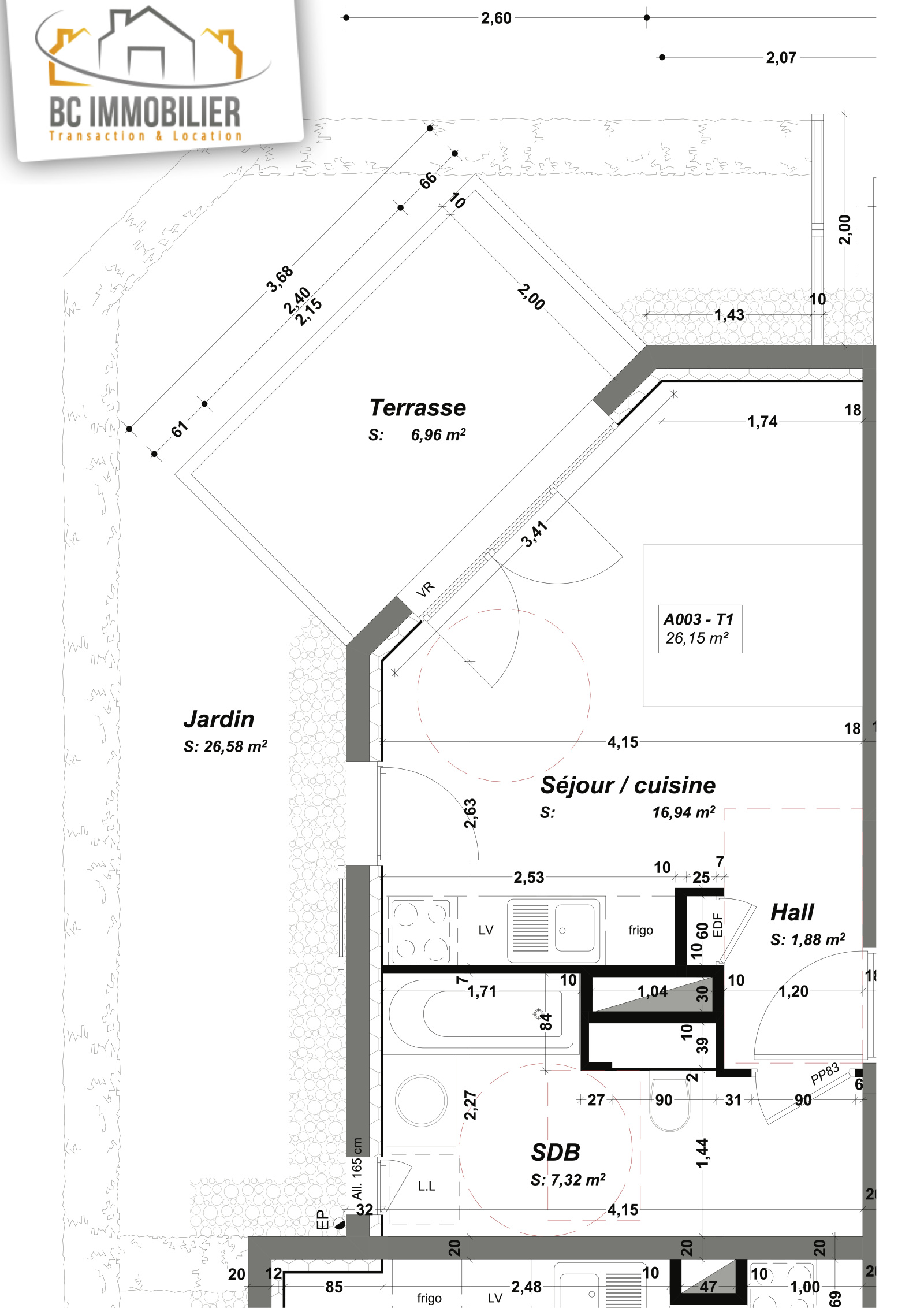 Vous découvrirez une pièce principale avec cuisine équipée, une salle de bains avec wc, une terrasse et un jardin de 26m2.