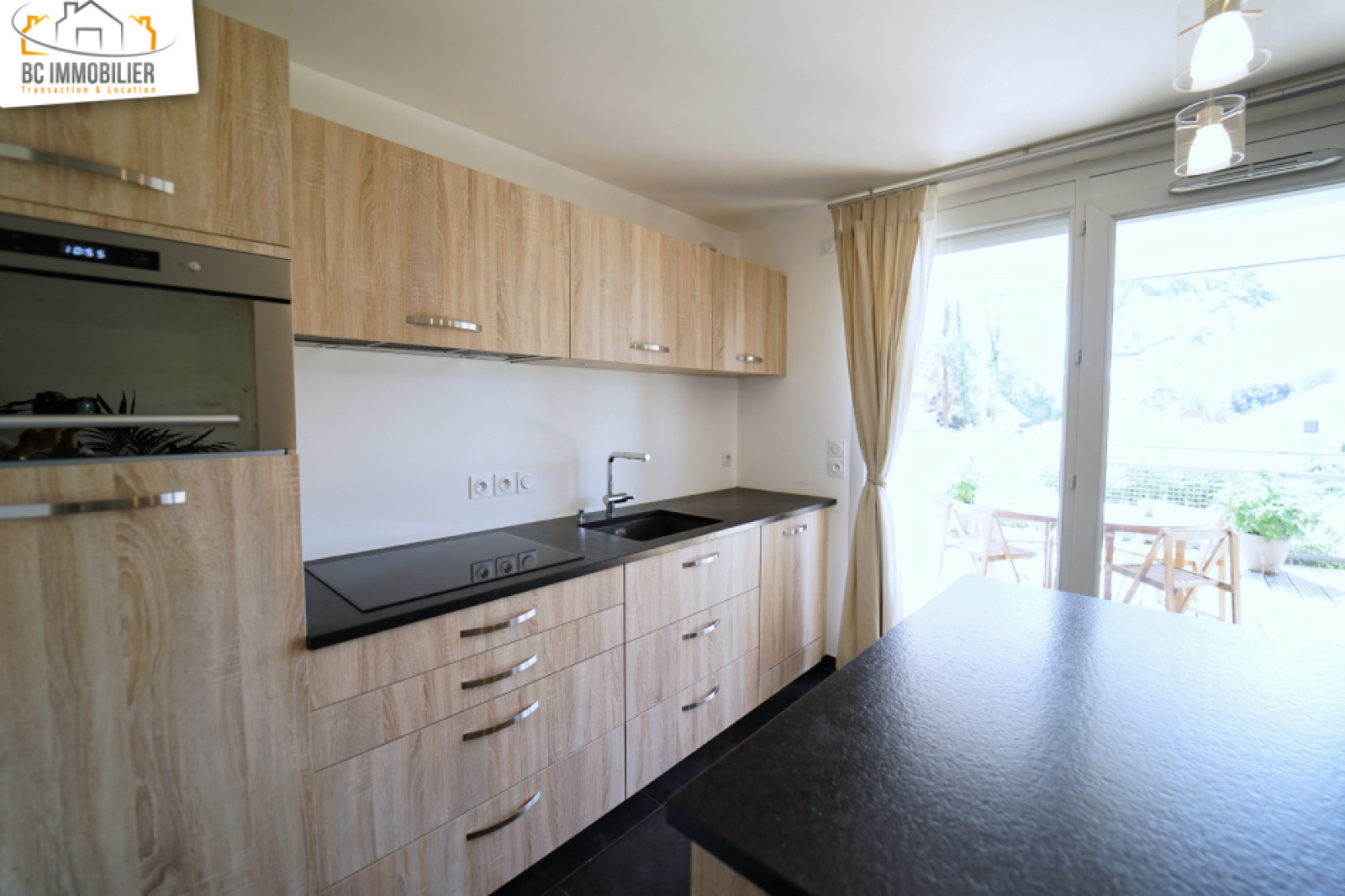 La pièce de vie ouverte de 27m2 sur la terrasse bénéficie d'une belle cuisine entièrement équipée avec ilot central, la chambre de 13m2 est équipée d'une grande penderie et donne également sur la terrasse.