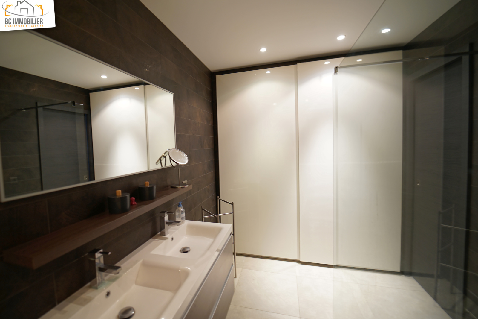 Une chambre au RDC avec sa salle de bains équipée de doubles placards est idéale pour vos invités, un cellier/buanderie et un garage complètent ce niveau.