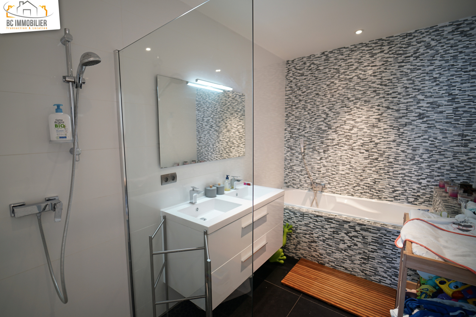 A l'étage, une grande mezzanine permet un coin lecture ou bureau, 3 belles chambres et une grande salle de bains équipée d'une douche et d'une baignoire vous donnerons un sentiment d'espace incomparable.